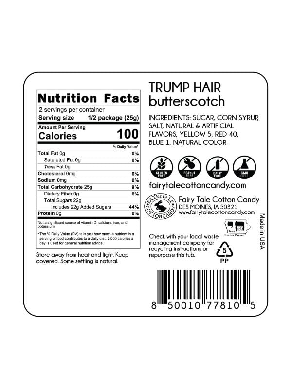 Yes, we know. We couldn’t resist labeling our fluffy and sweet butterscotch flavored cotton candy in his likeness. And in case your comb-over needs fluffing, this can double as a toupee! Democrats and Republicans agree, our cotton candy is the sweetest! Each batch of Trump Hair Cotton Candy is made fresh. All-Natural & Allergen-Free.